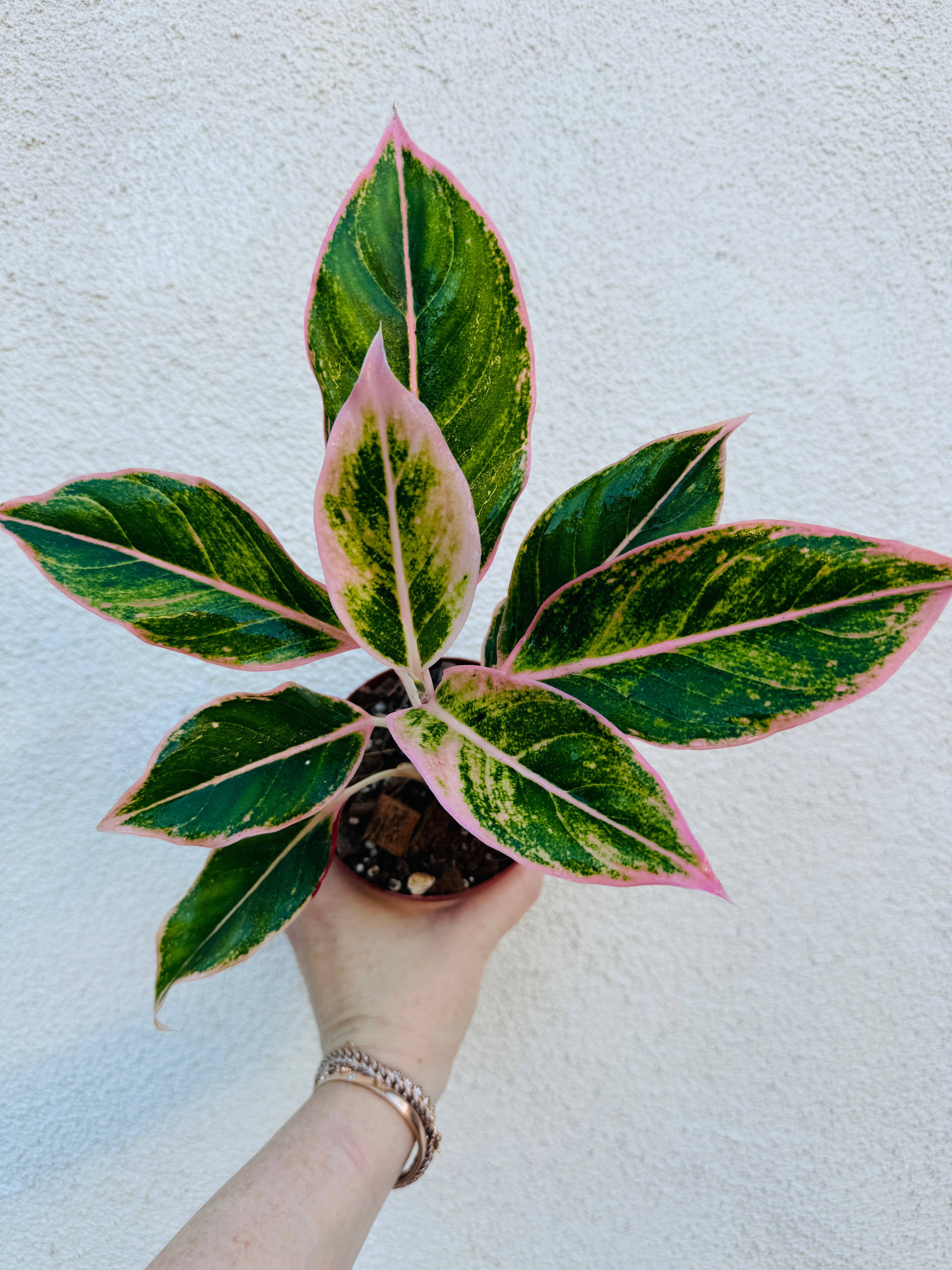 The Aglaonema Heng Heng is for sale at Plant Vault, is an exotic plant known for its striking, vibrant foliage. This rare houseplant, scientifically classified as Aglaonema sp., features large, glossy leaves with a captivating mix of deep green, light green and pinkhues. The plant’s variegation creates a soft, almost marble-like effect across each leaf, with varying shades of green and pink that give it an elegant, textured look. Native to the tropical regions of Southeast Asia, particularly Thailand, the Aglaonema Heng Heng thrives in shaded, humid environments, making it a perfect addition to indoor plant collections.