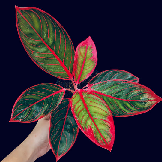 The Aglaonema Khanza is an exotic plant and rare tropical plant known for its striking, colorful foliage. This rare houseplant, scientifically classified as Aglaonema sp., features broad, glossy leaves with a rich blend of dark green, light green, and neon pink or red accents. The dramatic contrast between the deep green veins and the pinkish hues makes this plant demand attention, with each leaf displaying a unique mix of color. Native to the tropical rainforests of the Philippines, the Aglaonema Khanza thrives in the shaded, humid environments of Southeast Asia, making it a rare find in typical nurseries and a coveted addition for plant collectors.