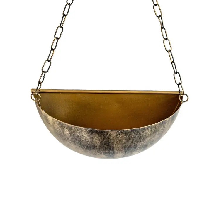 The antique brass finish of this hanging metal planter adds a rustic element that complements its modern decor style shape. This is a neutral piece that is sized perfectly to allow your plants your plants to pop, not scream.