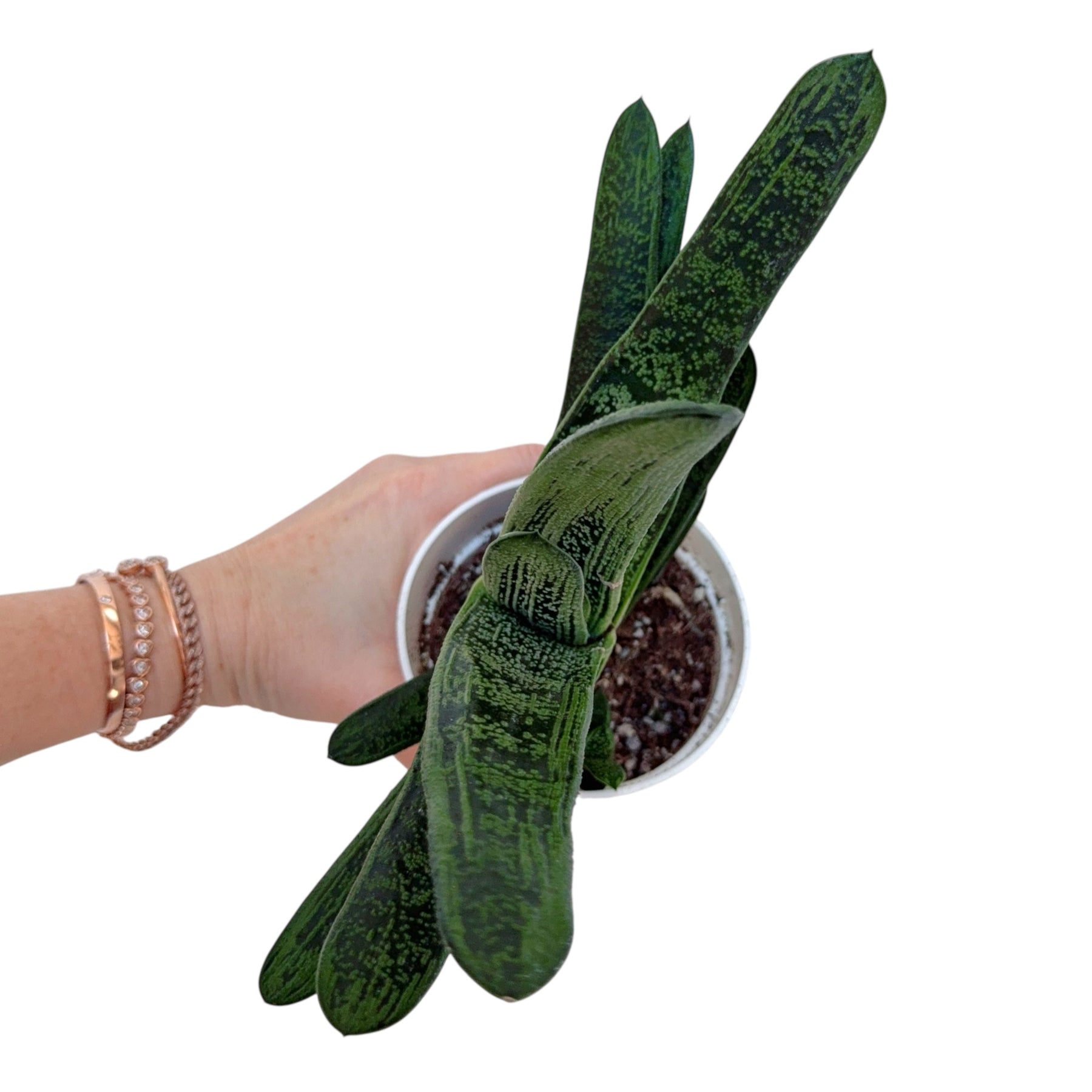 The rare succulent Gasteria bicolor var. liliputana—also known as Ox Tongue or Lawyer’s Tongue—is a compact, slow-growing plant that adds a designer touch to any collection. Its deep green, slightly rough leaves are banded with pale streaks and dotted textures that resemble the patterns you might see in a piece of luxury woven fabric. This exotic plant stays small, making it ideal for desks, windowsills, or curated displays, while its unusual leaf arrangement forms a rosette that looks architectural and modern.