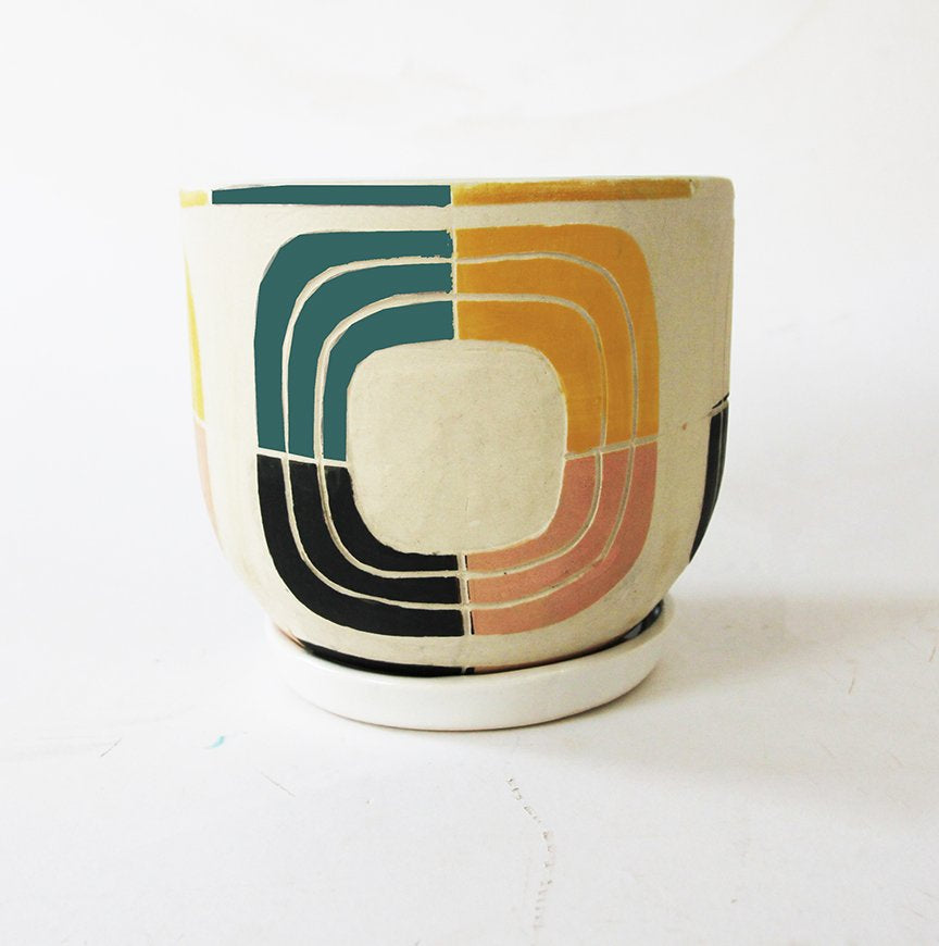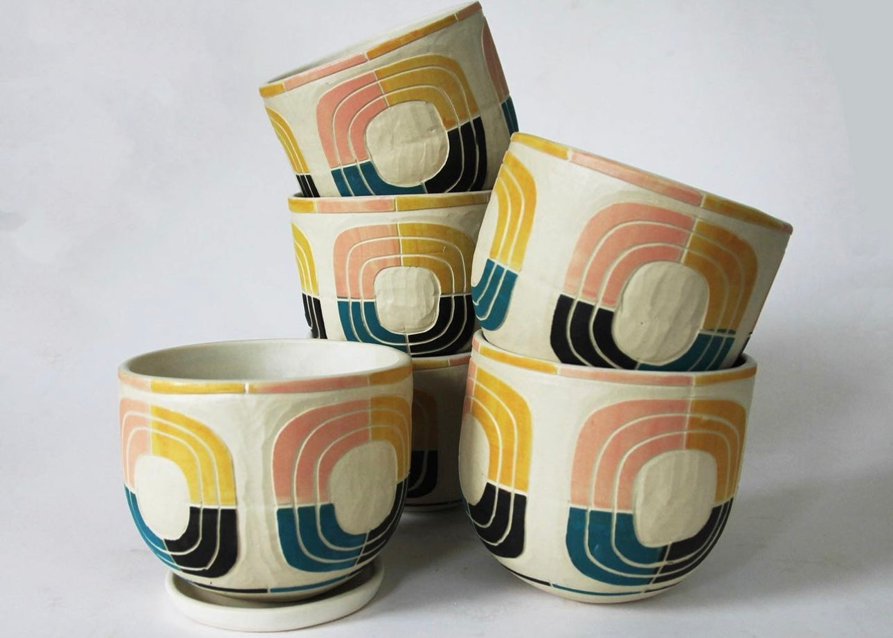 Introducing the hand made 5" planter by Nico Far West, a testament to exquisite craftsmanship and artistic flair. Each piece is meticulously hand-carved with intricate details, showcasing a stunning blend of four vibrant colors that instantly enliven any space. Complete with a matching tray, this planter exudes good taste, making it the perfect centerpiece for your most prized plants.