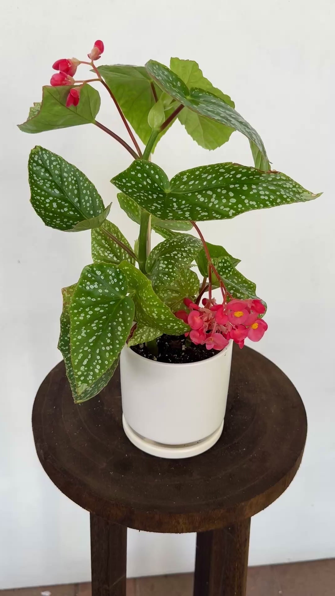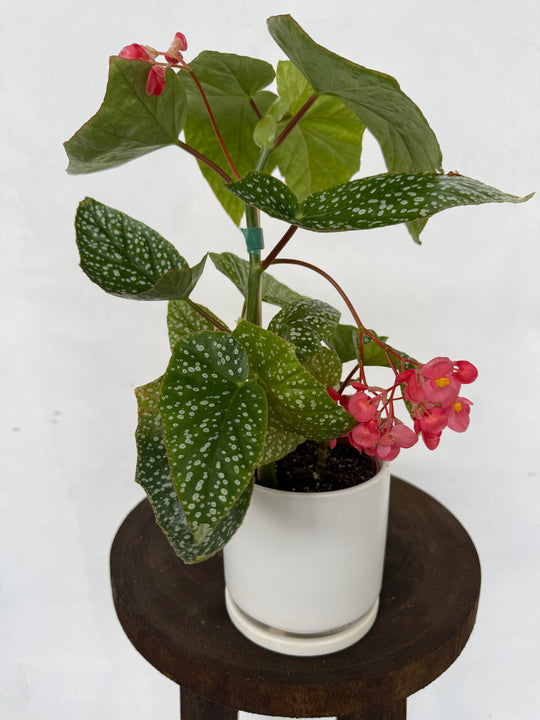 This rare tropical plant comes in a 4” pot and is called Begonia ‘Ice Cap.’ Its medium-green, wing-shaped leaves are heavily speckled with silvery-white, giving it a frosted, icy look. The edges are gently scalloped, and under the right conditions, it may produce small pink flowers above the foliage. Compact and upright in form, this begonia makes an excellent table or shelf plant and is rarely seen outside of specialty collections. It prefers bright, indirect light and consistent moisture, allowing the top layer of soil to dry slightly between waterings. Add a small amount of fertilizer at every watering. No moss pole needed.