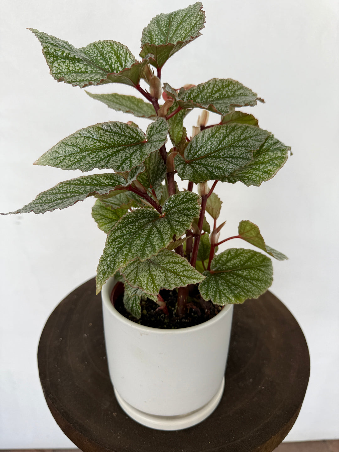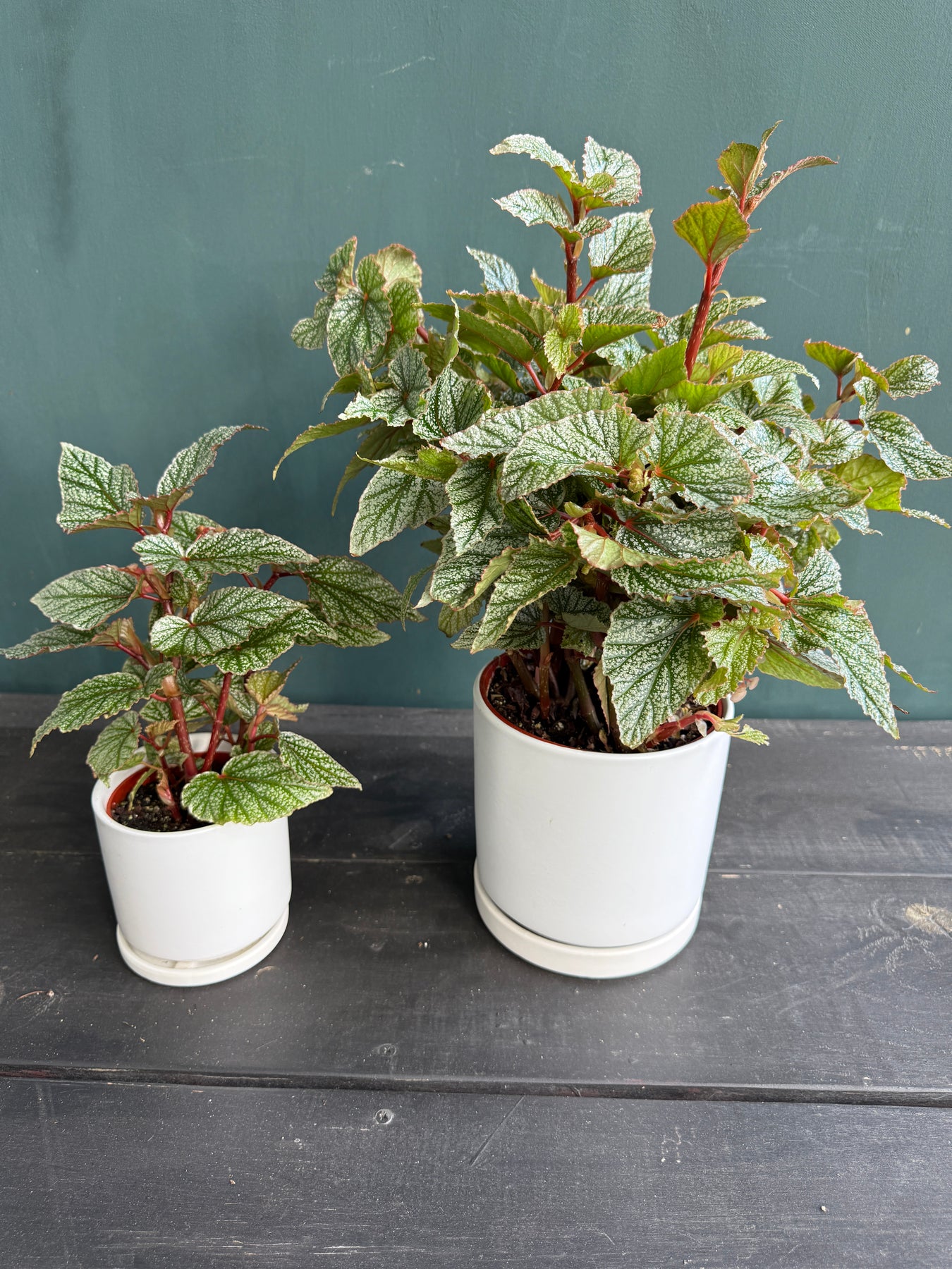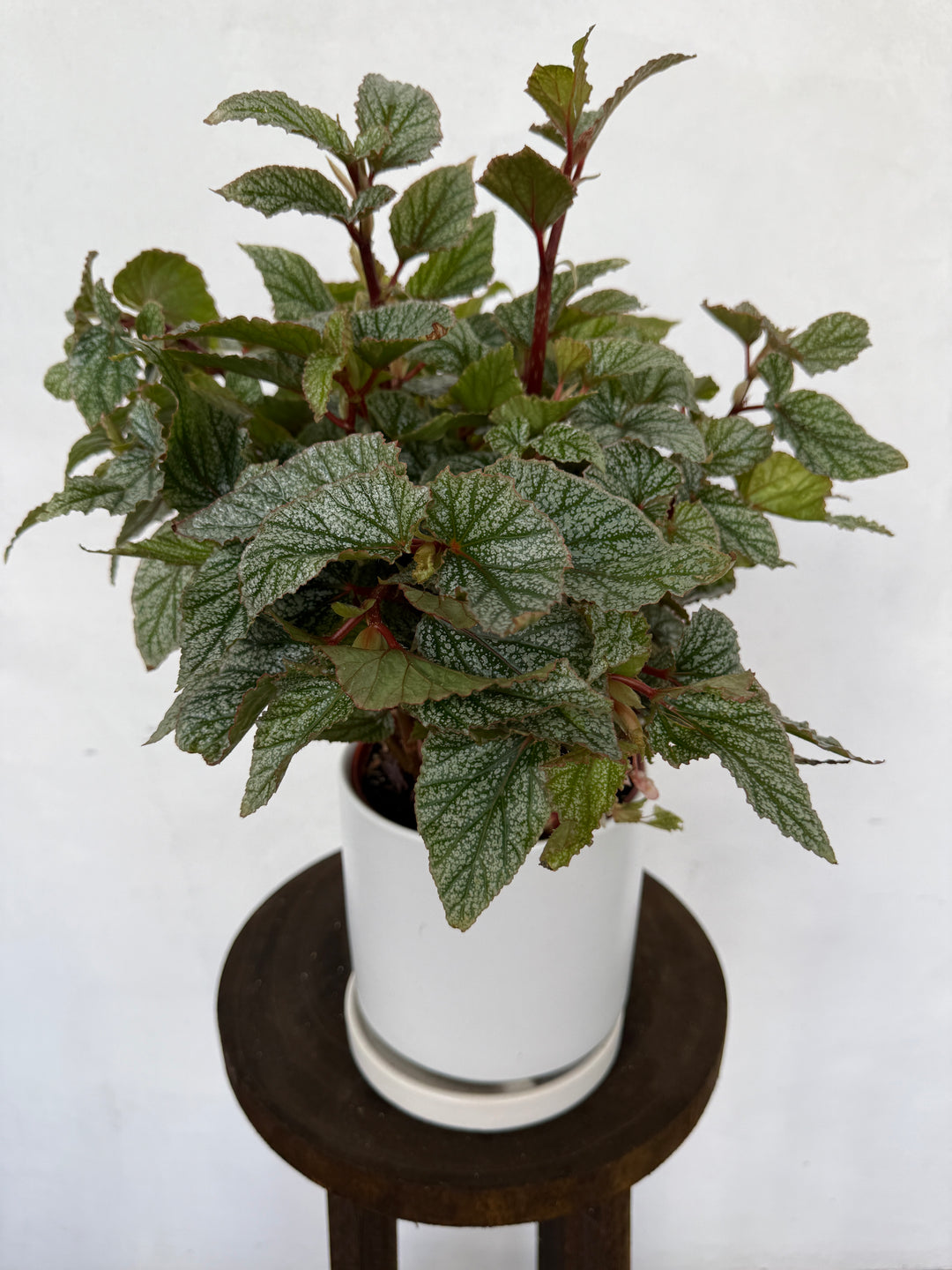 When mature, Begonia White Ice produces soft pink flowers in clusters, creating contrast against the silver-dusted leaves. The overall effect is clean and sculptural, with a modern feel that pairs well with both classic and contemporary interiors. It’s rarely offered and difficult to fine in nurseries, making it a sought-after addition for collectors and begonia lovers.