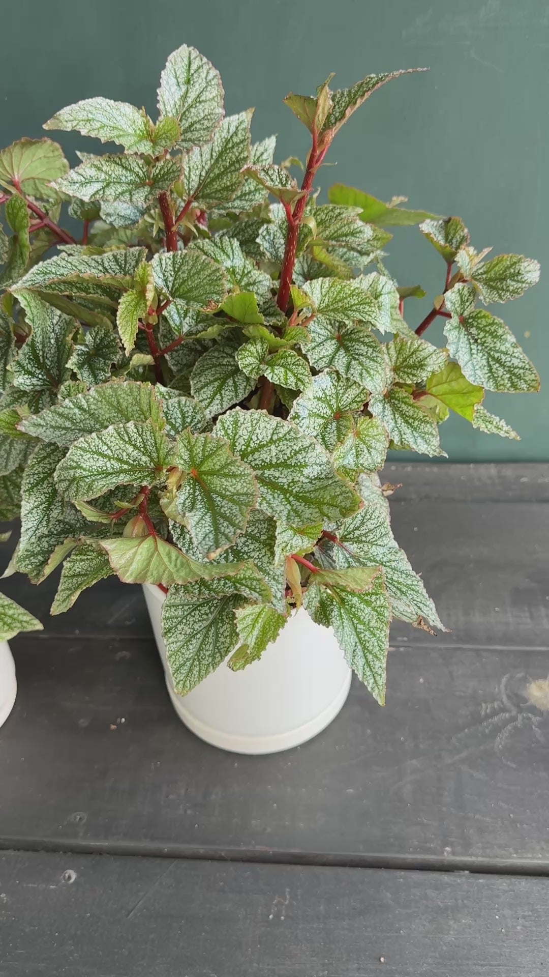 The rare, tropical plant Begonia ‘White Ice’ is a cane-type begonia known for its upright stems and long, narrow leaves covered in silver-white speckling. Native to cultivated collections and bred for its unique foliage and easy care. The leaves appear frosted—giving it the name White Ice. This plant has a vertical growth habit with branching stems, making it ideal for shelves or containers where its tall form and patterned leaves can stand out.