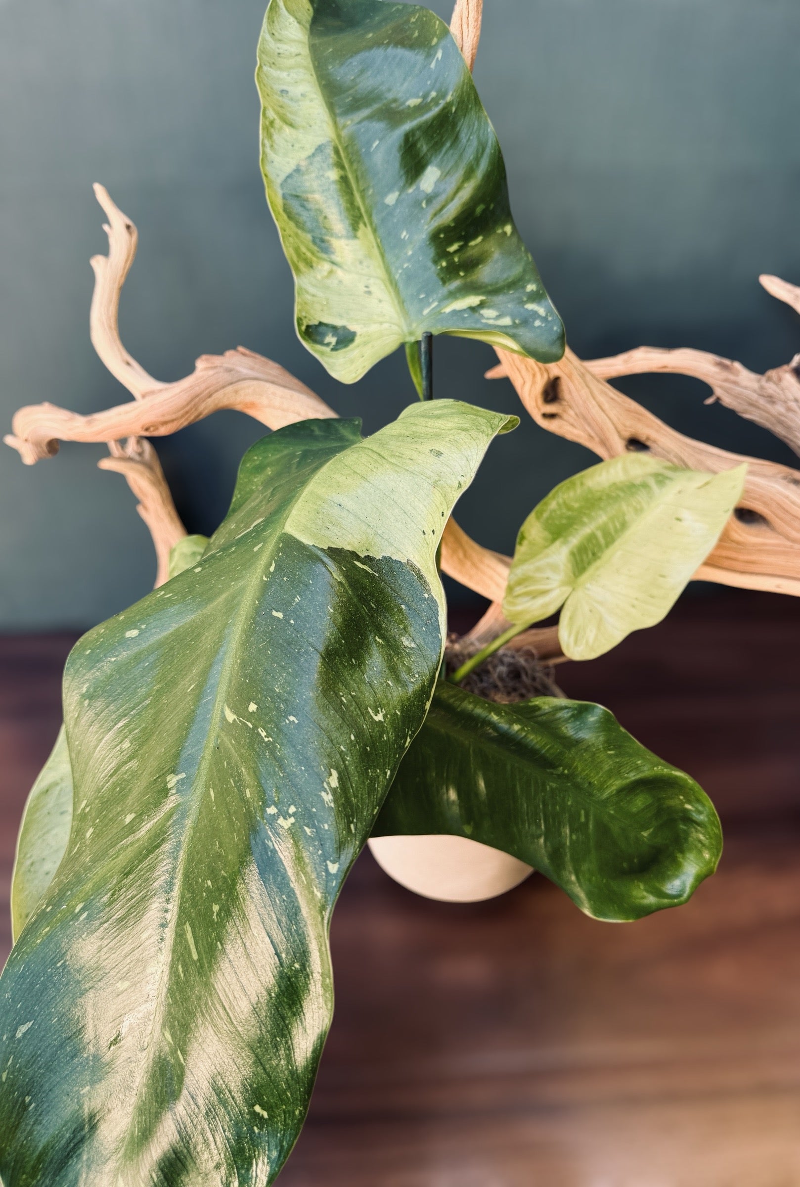 The Jose Bueno Philodendron is an easy-care rare plant that thrives in moderate to low, indirect light. It prefers slightly moist soil but should be allowed to dry out a little between waterings. This plant enjoys higher humidity, so placing it in a more humid environment or using a humidifier will help it flourish. For optimal growth, we recommend using trace amounts of balanced fertilizer at every watering. With minimal care, the Jose Bueno Philodendron will reward you with its beautiful variegated foliage and effortless elegance.
