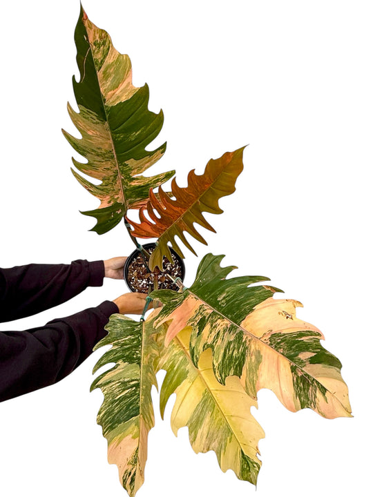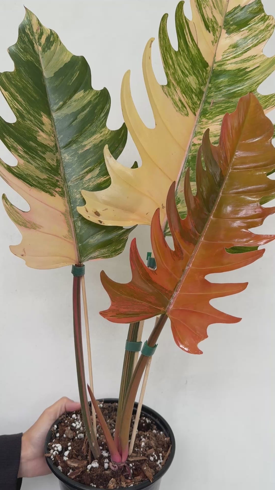 The exotic Philodendron Caramel Marble is a rare houseplant known for its large, serrated-edged leaves and dramatic marbled variegation. Each leaf on this mature plant displays a blend of caramel, cream, bronze, green and oftentimes pink, which is a highly sought-after coloration that comes from premium, stable genetics. This specimen is a self-heading aroid with thick petioles and a strong upright growth habit, making it a standout choice for collectors and interior plant stylists.