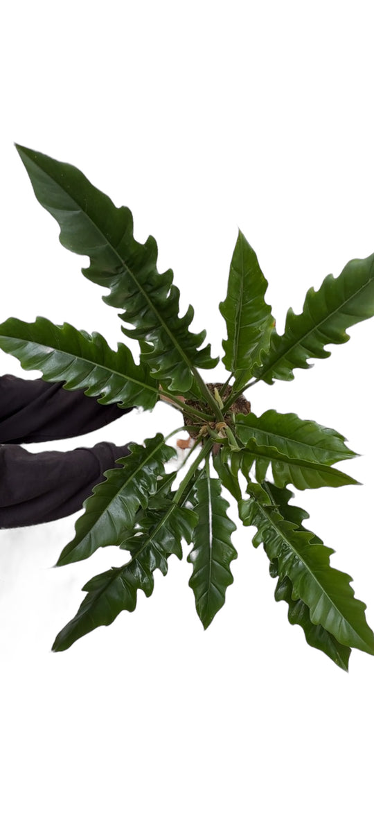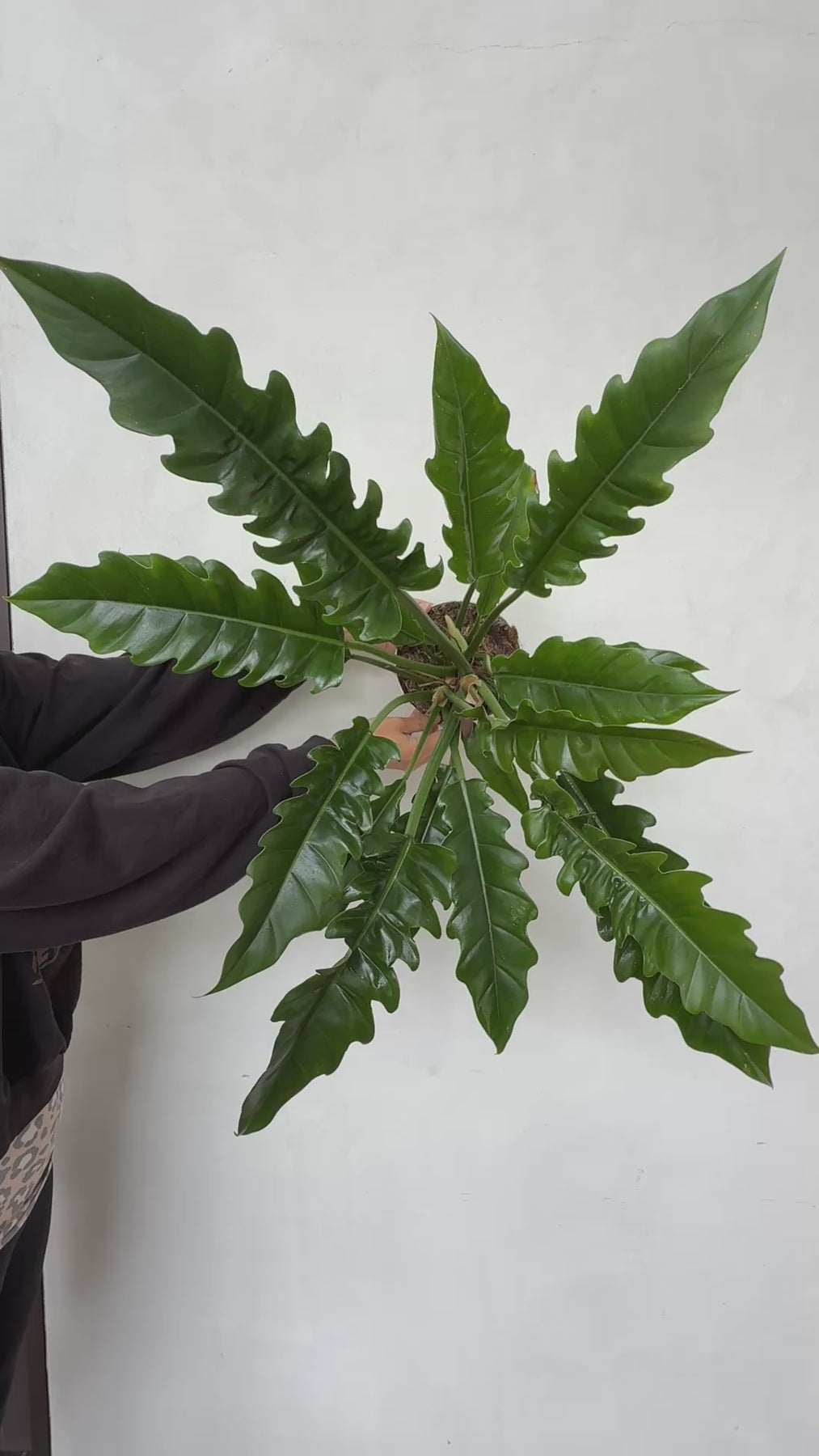 The Philodendron Jungle Boogie, also known as Philodendron ‘Tiger Tooth’, is a rare tropical plant with long, narrow leaves edged in deep, jagged serrations that resemble a saw blade. Each leaf can reach over two feet in length when mature, developing a glossy, leathery texture that emphasizes its sharp silhouette. The deep green foliage sometimes shows subtle variegation or light striping, depending on the growing conditions.