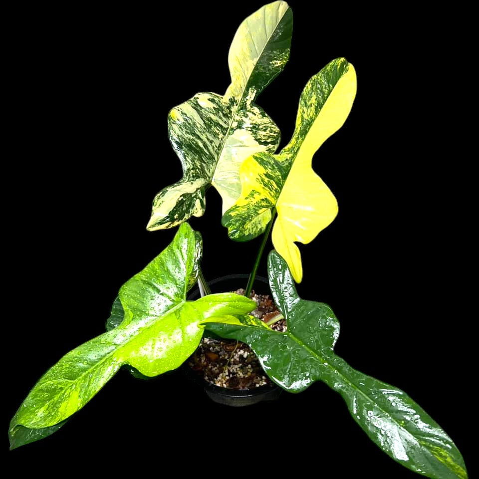 The Variegated Golden Violin Philodendron is for sale at Plant Vault, an exotic plant that stands out with its unique and stunning variegated foliage. This rare houseplant features large, violin-shaped leaves with bold splashes of creamy white and golden-yellow variegation against a rich green background. The distinct leaf shape, reminiscent of a violin, combined with its striking variegation, makes this philodendron a captivating addition to any plant collection. Native to the tropical rainforests of South America, the Variegated Golden Violin thrives in shaded, humid environments, making it an ideal choice for indoor spaces.Â